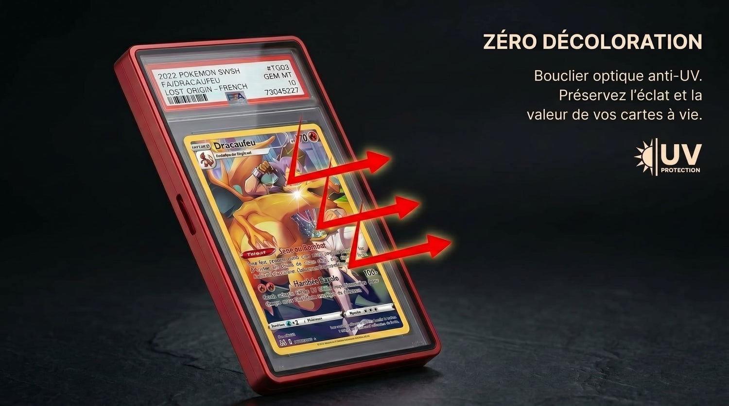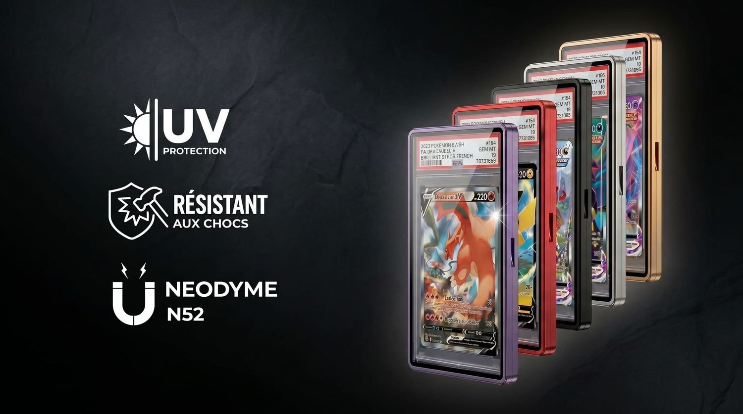 Notre châssis est usiné avec une précision millimétrique pour s'adapter parfaitement aux boîtiers des leaders du marché : PSA, BGS (Beckett) et CGC. L'ajustement est total, garantissant l'immobilité de votre carte sans aucune vibration.