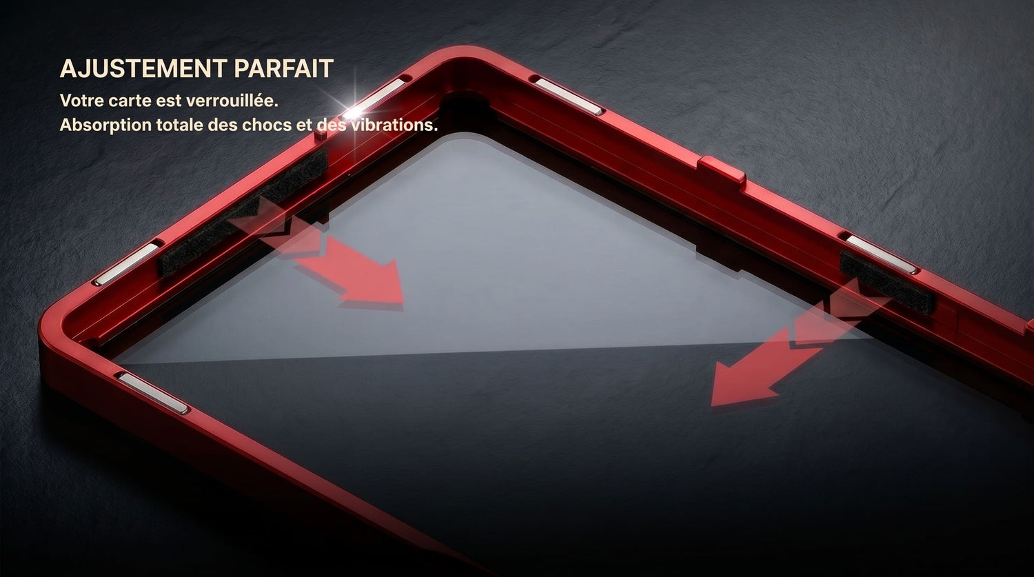 Aucun outil n'est nécessaire. Les deux parties du châssis en aluminium massif sont équipées d'un système de fermeture par aimants en néodyme à haute rétention. L'assemblage sécurise votre carte en une fraction de seconde avec un clic dense et définitif.